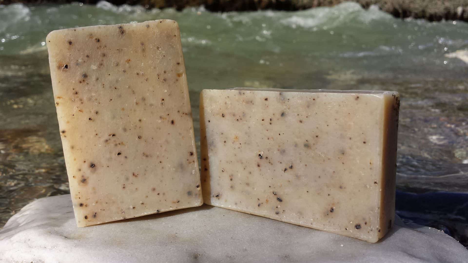 Gone Fishin’, scented with star anise and lime, with coffee grounds added for extra scrubbing power. Keep this soap in your tackle box and wash your hands and fishing gear with it and you may have better luck with the fishies.